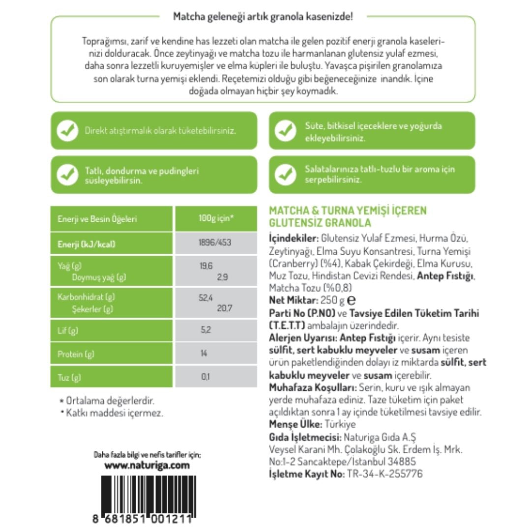 Düşük ısılarda fırınlanan (120 derece altında) ve elma suyu konsantresi ve muz püresi ile tatlandırılan Matchalı granolamız GLUTEN içermez.