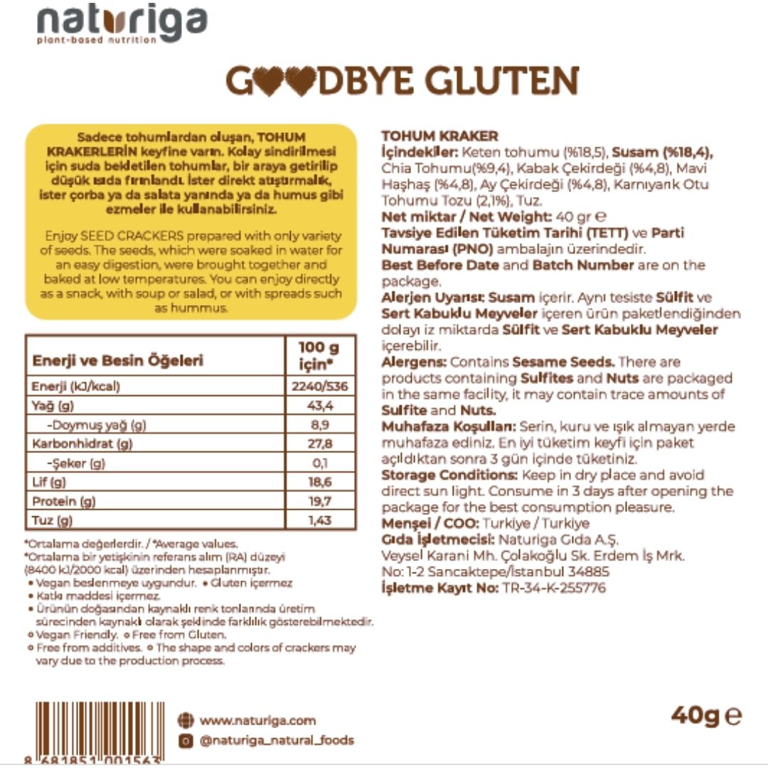 Naturiga'nın yepyeni "GOODBYE GLUTEN" masum atıştırmalıklar serisinin çıtır çıtır ve tuzlu üyesi Unsuz Tohum Kraker, sade ve besleyici malzemelerle hazırlandı. Minik lokmalar halindeki bu krakerler, gün boyunca dilediğiniz zaman atıştırmak için yanı başınızda.