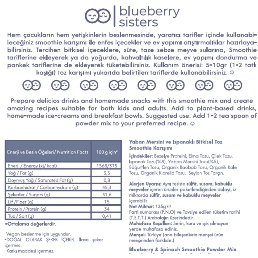 Ispanak Tozu(%8), Organik Chlorella Tozu, Yabanmersini Tozu*(%5), Organik Baobab Tozu, Böğürtlen Tozu*, Organik Kale Tozu, Seylon Tarçını.